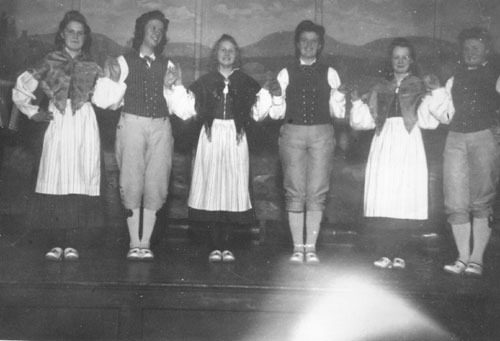 Bildtext: Från Bäckmora skola. Troligen någon form av teater på temat ”olika nationaliteter” med deltagare från flera skolor i socknen. Överst fv: Sig-Britt Fridlund(?), Lasse Hallberg, Rune Johansson. Mellanrad: Anny Sättlin, Märta Persson, Kerstin Svenson, Britta Lindblom, Anny Westlin, Främre rad: Irma Hagberg, Karl-Erik Franck, Karl-Hjalmar Åker, Kestrin Zetterlund, Maj-Britt Westling, Gunnar Brolin, Märta Eriksson. Främst på gåsen Einar Westling. En inkommen bidsynpunkt erinrar sig följande episod kring denna bild: Irma Hagberg (hon med solfjädern) läste föjande: Jag är den lilla körsbärsblomman, fin och rar och nätt. En sådan liten körsbergsblomma har ni aldrig sett.
