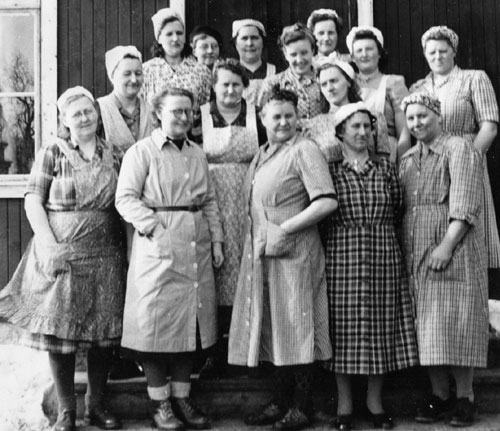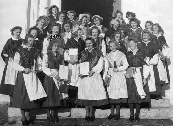 Bildtext: Duktiga unga bondjäntor står på kyrktrappan efter att fått diplom för sina insatser inom jordbruket. Så här stod det att läsa i Hudiksvalls Tidning: Duktiga enångersdamer fick på söndagen mottaga SLKF:s och Hushållningssällskapets diplom för sin insats inom jordbruket inom sin hemkommun. Uppgiftslämnaren har redan, som litet barn, skrivet var hans mor är: Anna Edström, Svedja (född Borin) men sen blir det svårare och här behövs hjälp att identifiera jäntorna av Sockensbilders besökare. Inkomna bildsynpunkter har gett ytterligare namn, dock utan exakt ordning, men i stora drag sett från vänster ser namnen ut som följer: Stina Sundin, Greta Hansson, Karin Olsson (Nordell), Stina Persson (Zättlin), Greta Haglund (2:a fv nederst),Inga Britt Asplund, Gunny Johansson, Anna Edström, Elin Nordin, Anny Zättlin, Eivor Renström, Emmy Westling (Collin), Eva Wiklund, Ester Holm, Märta Bodinsson, Margit Franck, Stina Persson (Sundin), Iris Olsson, Alice Westberg (Lantz), Ingrid Persson (Edström), Astrid Jonsson (Westling), Karin Wallin, Barbro Edström, Svea Wallin, Märta Persson. Ytterligare bildsynpunkt: Anna Jonsson g. Östlin står med där till höger i mitten i bilden ungefär.