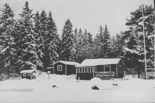 Bildtext: Notering på kortet anger: Betania i Bäckmora. Det är inte känt att det funnits någon frikyrka i Bäckmora, så gissningen är att det rör sig om ett frikyrkomöte antingen utomhus eller i skolan som ligger strax utanför bild till höger. Konstruktionen nere till vänster skulle kunna vara en provisorisk klockstapel. I byggnaden som skymtar till vänster bodde riksdagsman Eriksson. Byggnaden till höger finns kvar men är radikalt ombyggd. Bilden bör alltså ha tagits i backen intill Bäckmoraskolan.