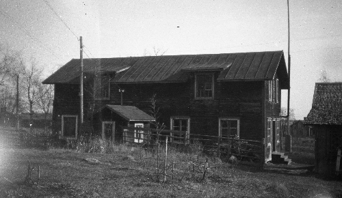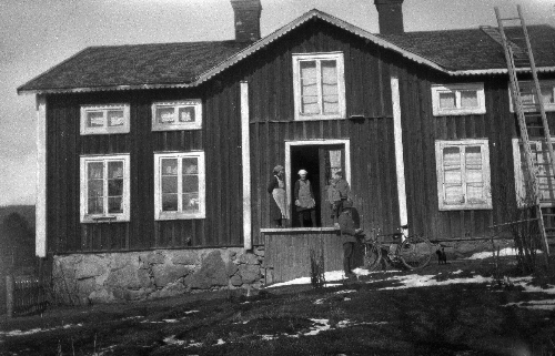 Bildtext: Okända människor vid okänd byggnad. Uppgifter emotses.