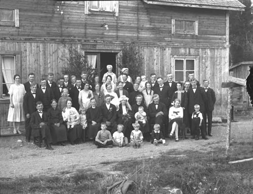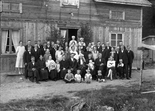 Bildtext: Vedmorabor samlade i närheten av Ångersjön i samband med en fest 20/7 1913. De sittande i främsta raden är fr v: Andreas Åker med sonen Per-Erik (släktboken 1K17, 1K31, 1K45), Alfred Svedlund (14G18, 14G20), Oskar Svedlund (14G18), Valter Sundkvist (5G28, 5G31), Anna Margareta Åker (1K32) Märta Åker (1K32), Anna Åker (med blommor) (1K31, 3M54), Ida Frisk (med gitarr) (1G115, 1G124), Karin Svedlund (också med gitarr) (14G18, 14G19) Hedvig Svedlund (med kråskrage) (14G18, 2H23). De sittande bakom de främsta är fr v:, Selma Norin (2V10, 2V14), Signe Svensk (4N12, 1G114), Emma Persson (piga hos Kjellins), Sara Åker, med sonen Jan-Olov (i keps) (7K2, 1K31), Johanna Voxberg med sonen Per (1K17, 7E23), Lars-Erik Svedlund (14G18), Hilda Olsson ”i lôke” (1V46, 1V54), Lars-Erik Åker (i hatt) (1K32), Anders Olov Hedkvist (i keps) (2M24, 2M34), Kristina Svedlund (8F26, 14G18), pojken Erik Nordin (i keps) (15D24, 15D35). De stående är fr v: Elov (i pappas famn) och August Olsson (4K7, 1V54, 1V62), ”Åkers Anna”, f Larsdotter (mor till Andreas) (9L1, 1K17), Johan Sundin ”Perjans Johan” (i hatt, längst bak, uppe tv) (1V45), Bricken Hedkvist (19D32, 2M34), flickan Kristina Åker, f Lindblom (med sidoknäppt blus) (1K31, 1V59), Erik Olof Svedlund (i skägg och keps)(14G13, 14G16), okänd kvinna, Maria Sundkvist (5G27, 5G28), ”Perjans Kristina” Lindblom (1V25), Stefan Vallin (i keps)(1V29, 1V46), Anna-Greta Nordin (5T16, 15D24), Ester (eller Anna) Jonsson (piga hos Svedlunds) (2M40?), handlare Isak Asp (i pipskägg och hatt) (3B12, 3B14), Lars Olov Brolin (i slokhatt) (2V8), okänd, Karin Asp (i stråhatt) (15D12, 3B14), gamla kvinnan Karin ”Kalla” Svedlund (2V8, 14G16), Manfred Sundkvist (i hatt) (5G28, 5G29), Albin Broberg (i keps) (14B23, 14B30), Johanna Enkvist (3N22, 3N33), Marta Olsson (”Fördelsgumma” hos Frisks i Vedmora, möjligtvis ifrån Bollnäs), Kristina Svensk (längst upp, med handen på framförvarandes axel) (2L37, 1G78), Anna Brita Broberg (14B16, 14B23), Sara Vallin ”i lôke” (i storrutigt) (11D14, 1V46), Kristina Frisk (i smårutigt) (14G16, 1G115), August Frisk (i mustasch och keps) (1G79, 1G115). Se även bild en-e-104 och en-m-140