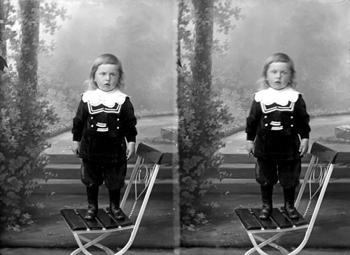 Bildtext: okänt kort, sannolikt söndagsskola, ledtråd: adresserat till Anna Andersson Rössånger. Damen uppe till vänster är Signe Nordin, mannen överst i mitten kan vara en av frikyrkopredikanterna knuten till Elim-kapellet i Enånger. Kvinnan nummer två från höger i den bakersta raden är Berna Andersson, dotter till Sånkmo-Bernard. Byggnaden i bakgrunden är sannolikt det tidigaste Elim-kapellet.