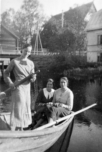 Bildtext: tre okända kvinnor i en båt. Platsen är dammen ovanför landsvägsbron i Bro, med gamla kyrkan, kvarnen och gamla posten (mejeriet) i bakgrunden