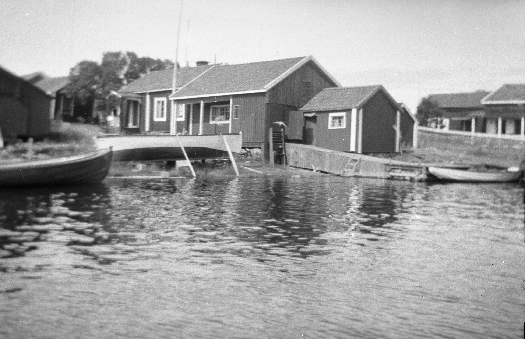 Bildtext: Identifierade personer: Folke Enström, Kalle Sundström, Adolf Henriksson, Emil Melin, Ville Melin, John Johansson. Platsen är inre delen av Agöhamn. Holmströms stuga till vänster och Hermanna Forssius stuga mitt i bilden. (Se även bild nr: obor-823)
