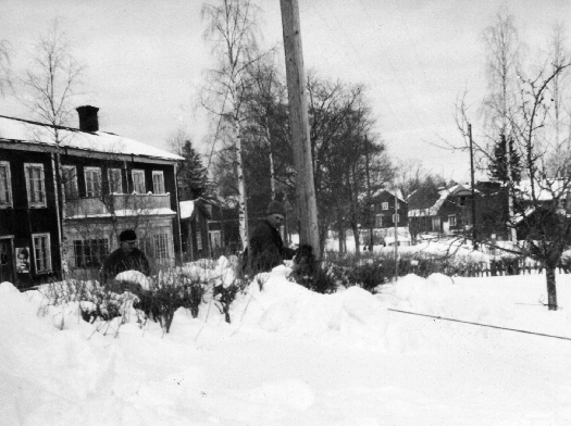 Bildtext: Två av bröderna Eriksson på Karskär, på väg med strömmingsskötarna för torkning. Fv. Gunnar o Per