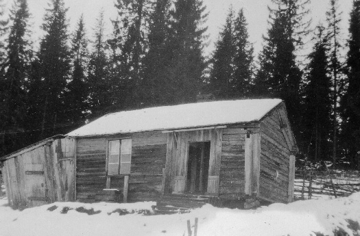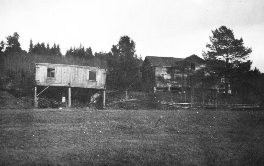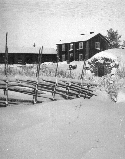 Bildtext: Fv: Per-Erik Åker, Karl-Hjalmar Åker, Doffner Johansson, Maivor Johansson. I bakgrunden syns fv: gårdarna i Nonå ( Nornå), Malmbergs gård och Missionshuset, sedermera hembygdsmuseum