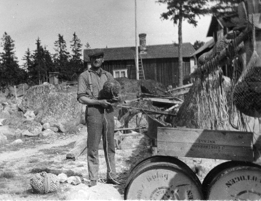 Bildtext: Från Våtnäs fiskeläge. Johan Lindblom, fiskardräng. Text på trälådan: J Gustavsson Våtnäs.