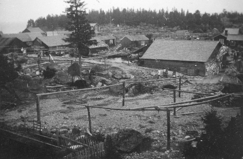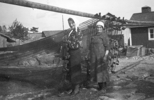 Bildtext: Gunborg Jonsson på Rävelsön tar upp vatten ur brunnen. Hon var gift med "Gladers" Olle Jonsson. Flyttade senare till Vad i Sandarne där de startade rökeri. Pojken till Vänster är Matti, hennes fosterson. Mannen kan vara Anders Svenson