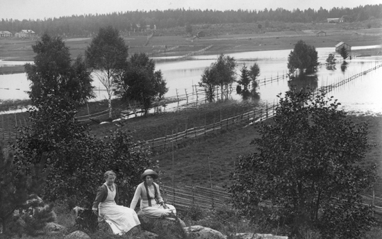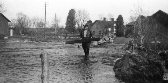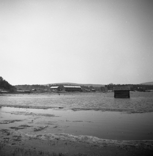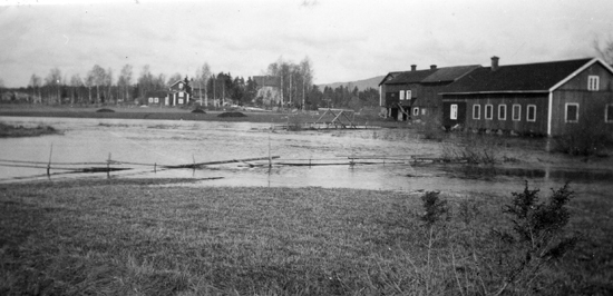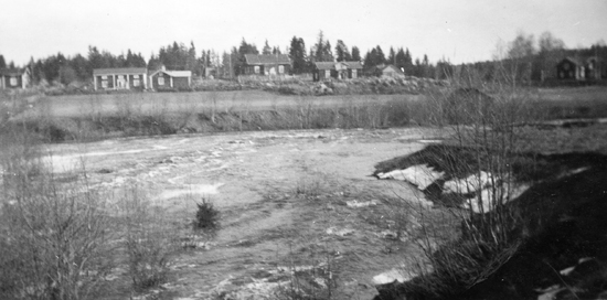 Bildtext: Enångersån under en våröversvämning. Fotat från Haga, uppströms. Staffasberget skymtar till vänster