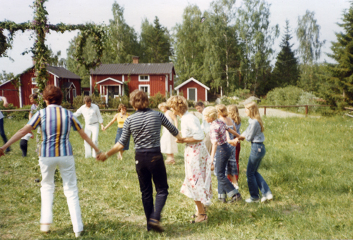 Bildtext: Bastu-syföreningen hos Enströms i Rössånger. Dom hade sedan auktion på sina alster i Hålsänge skola. Fv: Hedda Westberg, Edit Nordlund, Siri Enström på sparken, Karin Lindblom med Anna Nilsson i knäet. Fh: Emmely Nordin, Margret Östberg, Tilda Westberg, Dagmar Gustavsson, Anna Nordin. Överst: Sigrid Pettersson Maljis och mor Elsa Bergqvist. I mitten: Märta och Tonny Gustavsson, troligen Gerda Jakobsson