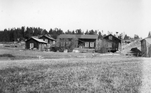 Bildtext: Gustav Johanssons gård i Finnika. Bilden tagen från väster. Ladugården till höger revs på kanske 1990-talet, och det lilla gårdshuset i mitten långt dessförinnan. Alternativ tolkning: Kan vara Valter Johansson hus där Kjell Johansson bor nu. Inkommen bildsynpunkt håller den senaste tolkningen som riktig