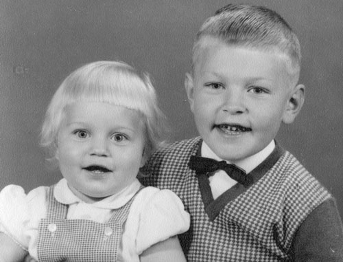 Bildtext: På Bergön. Henning Johnsson, Olle Bergström, Hedvig Enström, Elsa Bergström, Astrid Bergström, Arvid Enström, Eva Enström samt Ville Borin. På trappan till "Mittstugan" som idag ägs av Gösta och Astrid Westling.
