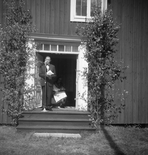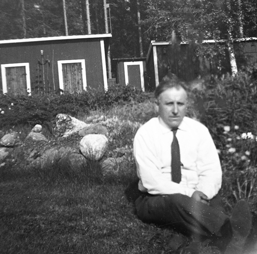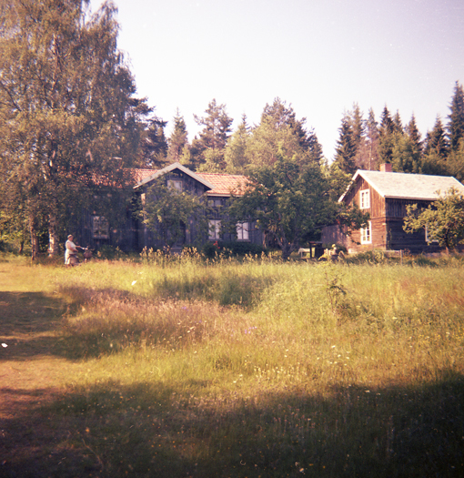 Bildtext: En tändkulemotor, okänd historik. Inkommen bildsynpunkt håller för troligt att denna tingest stod ut utanför Åkre gård. Om bilden är tagen före eller efter rivningen av gården (1964) är inte fastställt. Gården "Borins i Svedja" skymtar till höger.