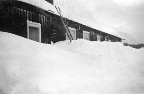 Bildtext: Rast i samband med vedkapning hos LarsHansas i Hålsänge 1961. Strax innan "vårannan" (antin med vårsådd mm.) var det alltid vedkapning i byarna. Då hjälptes man åt -är du hos mig så hjälper jag dig-! Här sittande Jonas i Svedja, liggande ErsPers-Erik med sin son Bosse, Bengt i Lôke, uppgiftslämnaren samt LarsHans-Olle. (Flasken innehåller svalkande hemgjord saft).