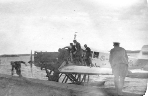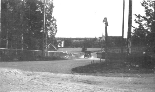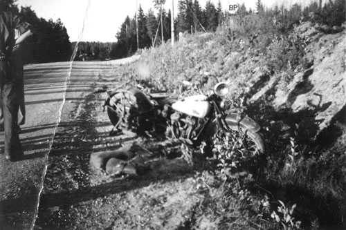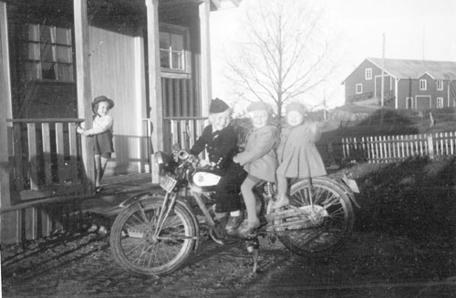 Bildtext: Fv: Johan Johansson (måg till Helmer Enström, Naimi g Enström f Johansson, dotter till Johan), Tage Enström, Johan Enström. Plats: Hemerå Tosätter, motorcykeln är av märket AJS, årsmod 1928. Inkommen bildsynpunkt meddelar: Motorcykeln såldes på 50-talet till en Rydbeck i Tosätter