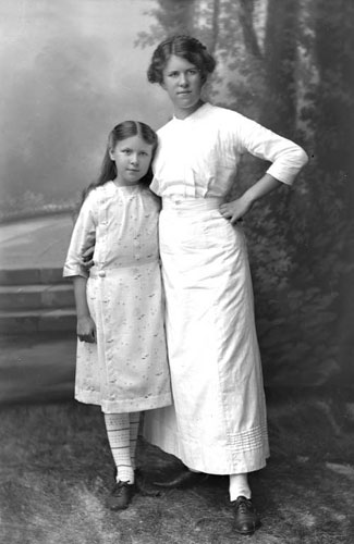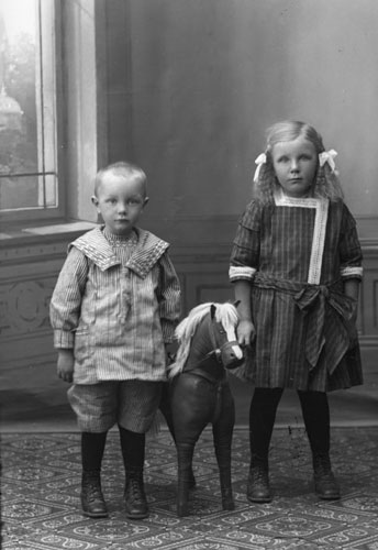 Bildtext: två barn med en spark försedd med sparklåda, Kerstin Svensson och Maj Kerslow. Möjligen utanför Brunlöfska gården med f.d. Francks (Brogård)skymtande