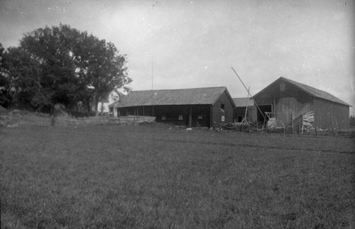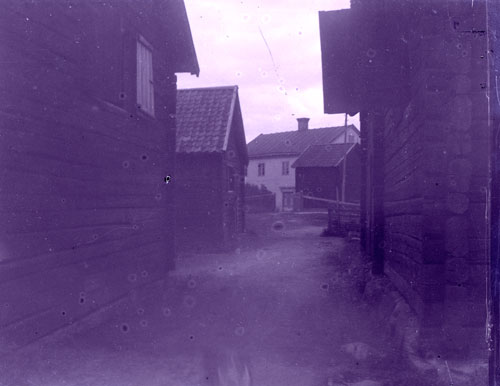 Bildtext: Grupp på sex personer och en hund, troligen i trädgården nedanför Brunlöfska huset, Elim-kapellet skymtar genom lövverket. Inkommen bildsynpunkt: Verkar att vara Arvid Enqvist längst till höger