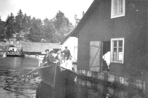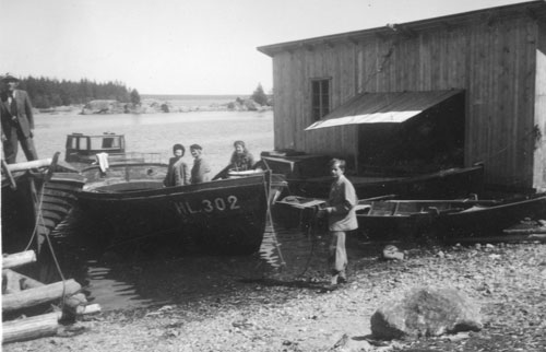 Inkommen bildsynpunkt meddelar: Bilden tagen i Finnickaviken. HL 302 är Olle Jonssons båt. Boden till höger är idag påbyggd och ägs av Carl Johan Bergströms efterlevande. Båten till vänster kan möjligen vara Gunnar Åkerlunds. Ytterligare bildsynpunkt: De i båten är Signe Nordin, Tekla och Kerstin Svenson, på stranden står Veli Varjoranta.