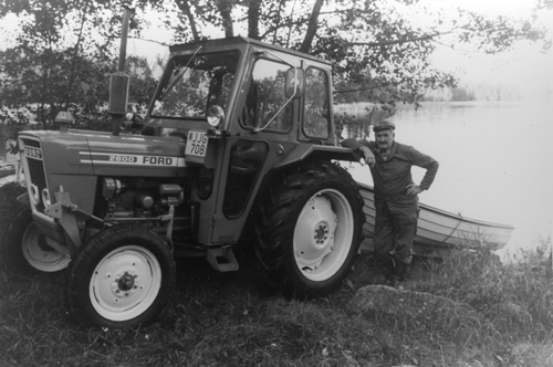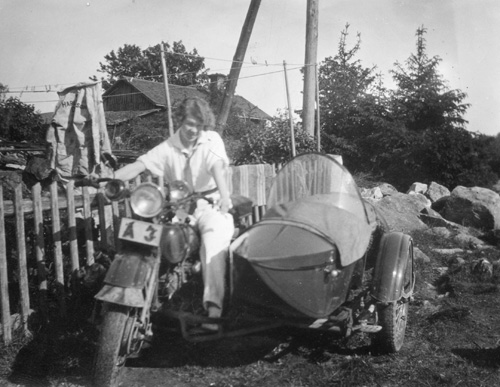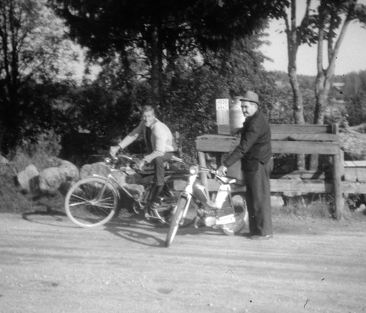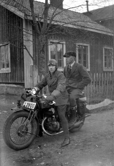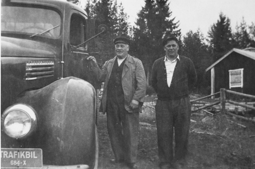 Bildtext: Till höger Folke Persson från Oppänge, med trafikbil. Inkommen bildsynpunkt: tv C W Borin i Svedja, 1871 - 1955, far till Folkes svärfar Axel Borin, Nyåker. Sannolikt på besök i Västeråcka.
