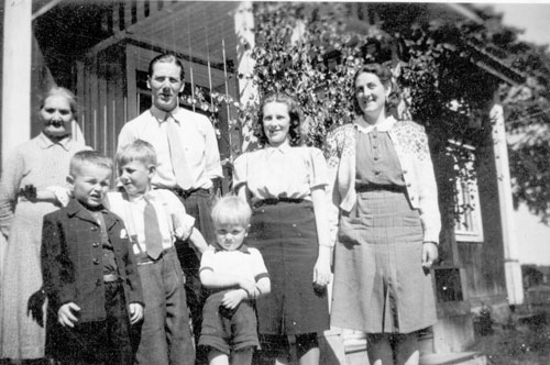 Bildtext: Fv: Anna-Britta Forsberg f Åker, Rune Olsson, Jan-Bertil Forsberg, Alfred Forsberg, Jan Forsberg, Hanna Forsberg, Maria Forsberg. Plats: utanför Elof Olssons fastighet i Vedmora