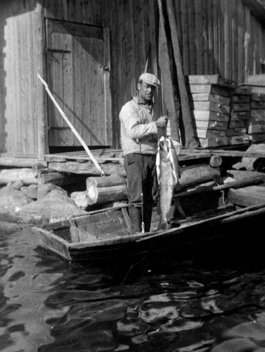 Sökord: man, eka, båt, sjöbod, gäddor, Motivkategori:fiske Id:13228 Fotograf: okänt Fotoår: tidigt 1930-tal Bildnummer: bere-383 Förening: Enångers hembygdsförening Land: SE Motivplats: Gävleborg, Enånger, Bergön Teknik: Inskannat foto Rättighet: privat Originalplats: (visas ej publikt)