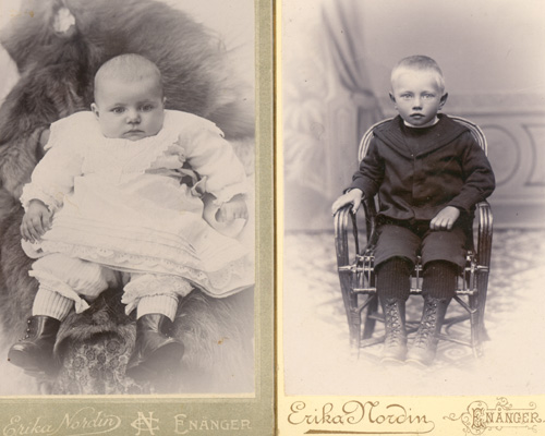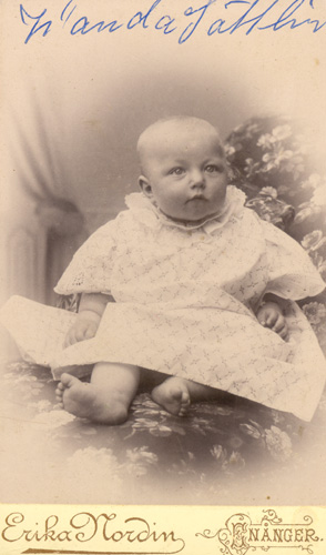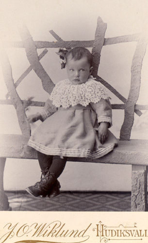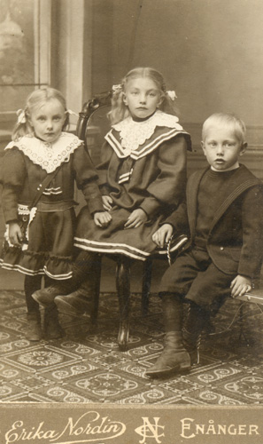 Bildtext: Henrik, Lisen, Walter Wanda Kompletterande bildsynpunkt: Makarna Henrik Sättlin (1872-1952) och Lisen Holmin (1873-1950): Barnen Valter född 1895, Wanda Kathrina, 1896-1901. Systern född 1901 döptes till Vanda, men alltså ej med på denna bild. Sistnämnda enligt en teori via en inkommen bildsynpunkt