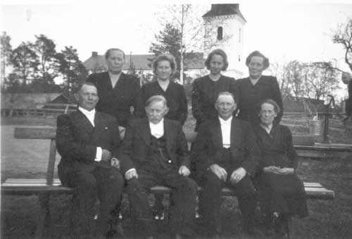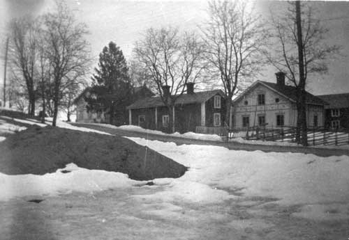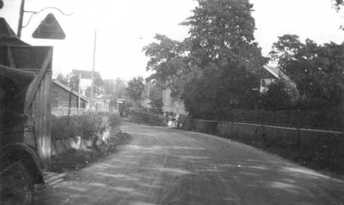 Bildtext: landsvägen i Svedja med gamla kyrkan i bakgrunden, sett söderifrån. Byggnaden i centrum är Nyhem, kyrkskolan till höger utanför bild. Skylten till vänster anger Shell bensin, notera bilen som skymtar i bildkanten.
