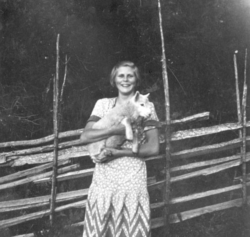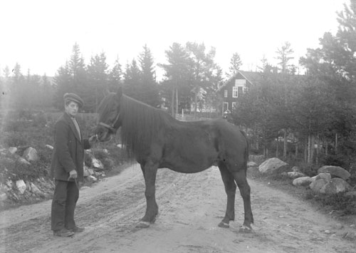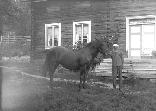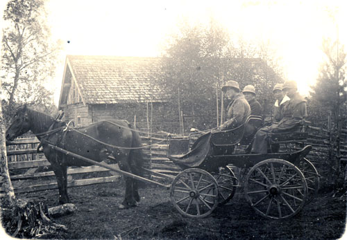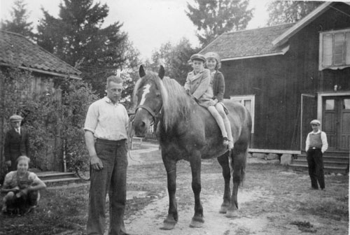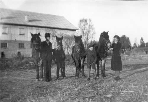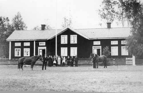 Bildtext: Gården ”Per-Hans” i Tosäter. Framför huset syns Karin Melin med barn och barnbarn. Hållande hästar: till vänster Emil, till höger Wille.