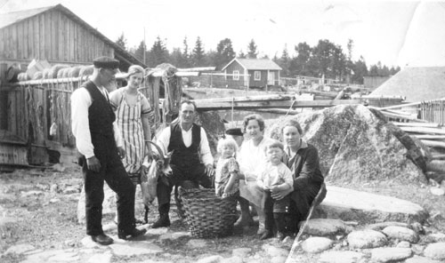 Framför staket från höger (finns synpunkter?): Per Olov, Valter, Gösta, Ester, barn okänt, Alve, Signe?, Anna, okänd, Einar, Olga?, okänd, Karin.