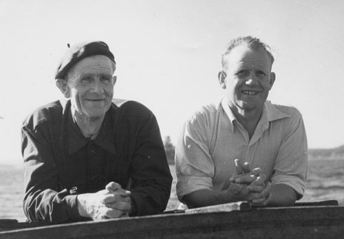 Bildtext: Beträffande båten i centrum på bild(Titanic) med historik mm så hänvisas till kommentarer på bild nr gello-001 och en-e-94 och en-l-102. Denna bild är från Våtnäs fiskeläge 1914. Följande namn finns noterade: I segelbåten E O Norling, Greta Norling m barnen Gunnar o Anders-Olov samt barnens morbror Adolf Nordin. I Titanic: Jonas Östberg (stående, tillika båtägaren), J O Jonsson(?) samt okänd. i ”snebben”: Viktor Nordin. På bryggan bla: sittande Karin Brolin, Inga Gustavsson, Helena Jonsson, Bricken Nordin, Marta Norling. Stående: Jonas Jonsson, Per Olov Brolin, Janne Gustavsson, Axel Brolin, Jonas Östbergs dotter, John Bergkvist samt ett antal okända.