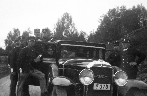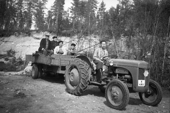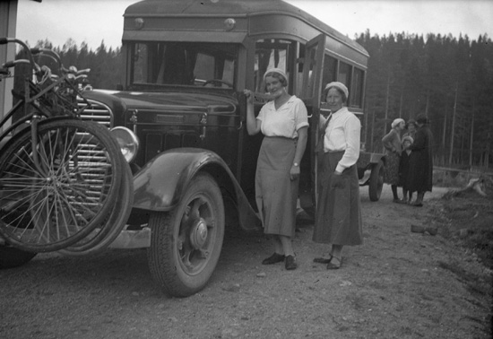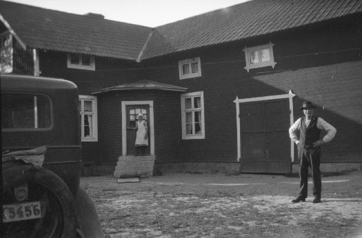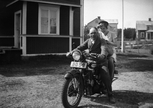 Bildtext: Ett par på en motorcykel av märket Husqvarna. Platsen bör vara intill skolan i Tosätter. Edvin Blomberg, brevbärare (bodde där Sigvard och Monica Sundin bor) och Jenny Johansson som lånat Blombergs uniformsmössa. Inkommen bildsynpunkt:Bilden är från gården Hanses. Skolan till höger, lärarbostad i mitten och till vänster bakdörren till Hanses