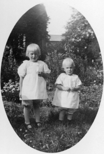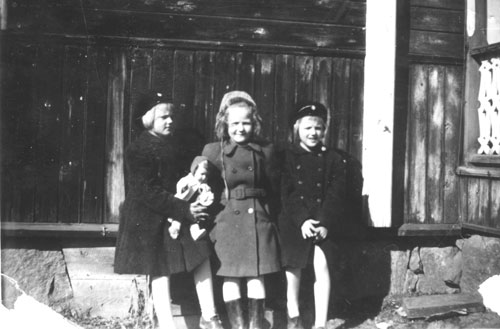Bildtext: På bron i Wästnång, Finnika. Fv: Kaj Berglund, Lennart Sjödin, Sigrid Westling (i dörröppningen), Kerstin Westling (Larsson), Göta Sjödin och Sven Westlings döttrar Gunilla och Monica