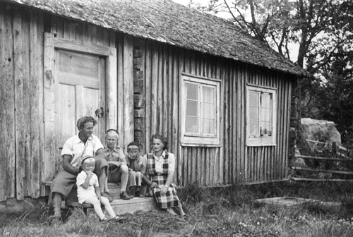 Bildtext: Fv: Margit Eriksson, Rune Holmqvist, Astrid Holmqvist, Lena Eriksson, Bertil Holmqvist, Anna Holmqvist, Ann-Mari Holmqvist, Irene Eriksson, okänd. Platsen är Vitsand i Essvik