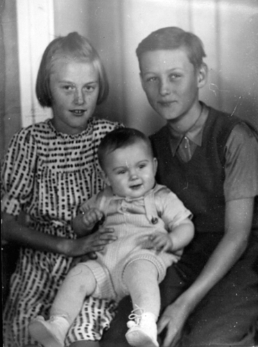 Bildtext: Ada Johansson (från Rössånger) med barn och deras familjer. Främre rad fv: Anni Westling, Kerstin Bergström, Bibbi Westling, Maj-Britt Johansson. 2:a rad: Stig Johansson, Ada Johansson, Yngve Westling, Eje Bergström, Håkan Bergström (skymd). 3:e rad: Gunnar Johansson, Gunhild Löjdström, Elin Johansson, Märta Bergström. Övre rad: Hilma Edbrink, John Edbrink, Astrid Westling, Otto Bergström, Sigfrid Löjdström, Johan Westling