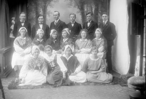 Sökord: gruppbild, män, kvinnor, folkdräkt, hembygdsdräkt