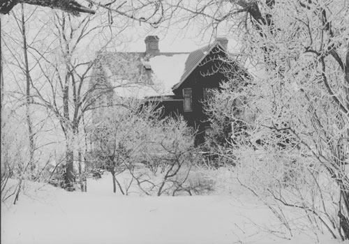 vinterbild på en byggnad , delvis dold av ett buskage, Brogård (Francks)