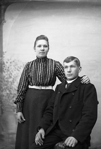 Gustav Sjölin samt en kvinna som uppges heta Anna. Se även bild cae-priv-14 och -15. Inkommen bildsynpunkt: g är 99% säker på att bilden föreställer Nils Gustav Sjölin, född 24/5 1879 i Grängsjö. Gustav var halvbror till Per Sjölin som sedermera kom att grunda Sjölins Smide. Kvinnan är säkerligen Anna Thorild Bäckman. Gustav och Anna var gifta. De fick tre barn Sven, Erik och Gösta. De emigrerade 1907 och bosatte sig i Chicago. Hälsningar Magnus Sjölin