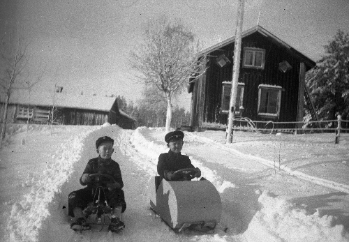 Sökord: pojkar, rattkälke, byggnader, hus