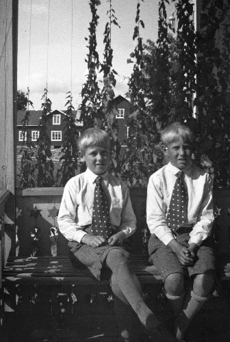 Bildtext: Från vänster:Axel Westberg, Hans Westberg, John Johansson, Ester Westberg, Anna Hansson, Jenny Johansson, Emil Hansson, Ingemar Fernlund, Olle Johansson, Ester Fernlund och Lasse Fernlund. Vid Emil Hanssons fäbodstuga i Österåcka