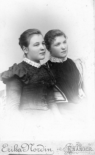 Text på kort: "kusiner till JM". Tolkas som släktskap med Johan Malmberg, se bild med nr: sob02 Inkommen bildsynpunkt spekulerar: De skulle i så fall kunna heta Strandberg och komma från Borka. De var sex barn i familjen och alla var de flickor. Bland dem modern till Ester Sjödin i Vedmora.