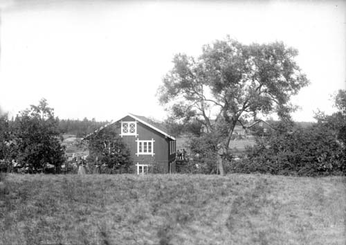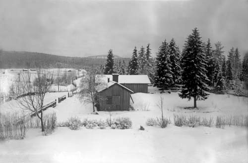 Bildtext: gården ”stolpen” i Vedmora, sett mot söder, bagarstugan i förgrunden. Tv gamla vägen mot fotbollsplan