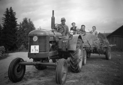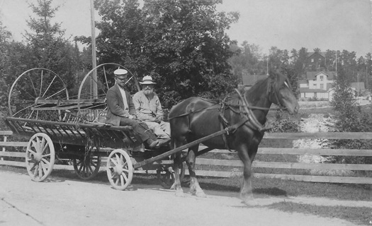 Bildtext: Hästfordon, trilla lastad med hövändare. Mannen med skägg är Johan Winlund f 1851, bruksarbetare i Långvind, kusk Erik Fernlund från Långvind. Hästen. Donna. Platsen är Enånger, och i bakgrunden skymtar bl.a. Brogård, Bernanders järnhandel och (skymt) Sundins café. Inkommen bildsynpunkt: Johan Winlund är min farmors far. hanns dotter Frida Kristina Winlund gifte sig med Anders Gustav Andersson 1902 samt flyttade till Edsbro i Roslagen.