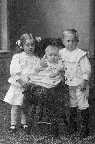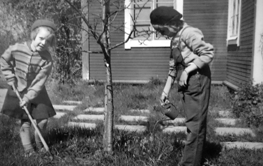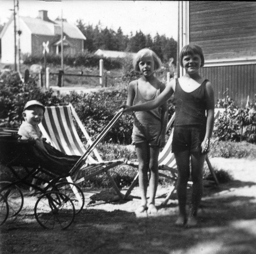 Bildtext: Anna och Hilmer Juhlin med barnen Tore och Majbritt vid Söröns fiskeläge. Kvinnan till höger okänd