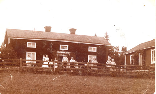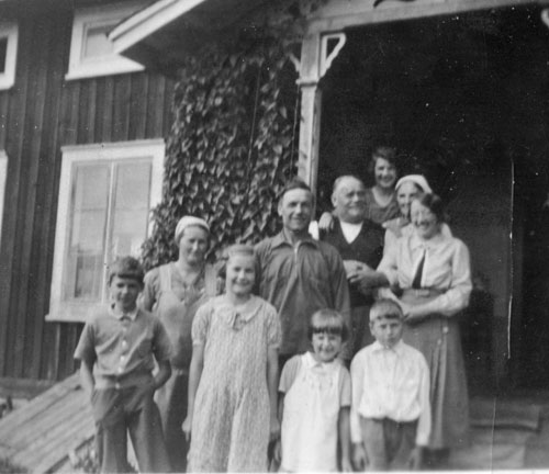 Bildtext: Tisdagsmorgon 15 augusti 1950 kl 04.00 i Svedja. Jenny Borin uppvaktas på sin 50-årsdag. Uppgiftslämnaren, (då drygt 3 år), väcktes av stojet denna tidiga morgon, sitter i pyjamas i mor Annas famn. Längst fram döttrarna Karin f 1941 och Anna f 1923. Jenny och hennes make Karl samt svärfar C W Borin. Bakom C W, Mimmis Karin (Se även bild nr: en-b-43). Många utklädda, bl a Hanna Haglund i mörk kostym med fluga och hatt. Till vänster om henne Karin Sundqvist. Längst till vänster systern Agnes med sin make Johan Sjödin. Längst bak skymtar sonen Jonas samt svågrarna Axel och Wille Borin.