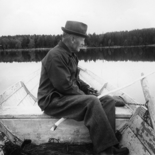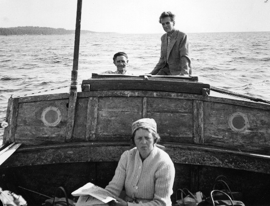 Bildtext: En grupp människor i en välfylld fiskebåt, sannolikt på väg mot resemål i Enångers skärgård. Platsen är Borka brygga