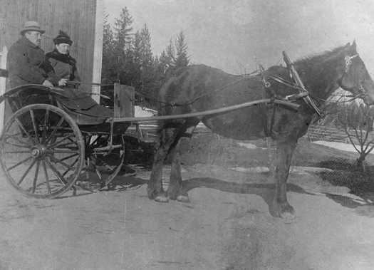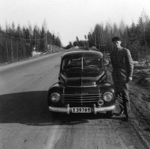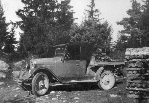 Bildtext: Okända människor vid en stuga i Ljustjärn intill Känna. Stugan ägdes då av Victor Sundqvist. (Regnr på bilen: X2777, vems??). Inkommen bildsynpunkt: Min morfars stuga som byggdes 1927. Min morfar Victor Sundqvist längst till höger och hans dotter Elsa (g Öhlund) till vänster.