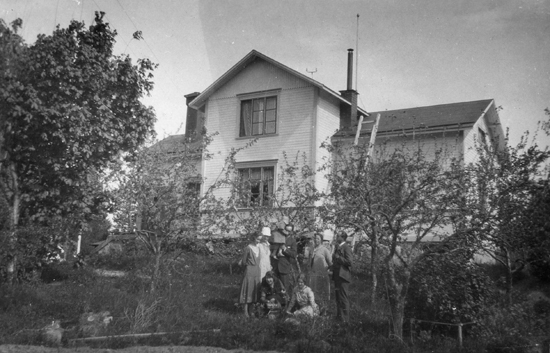 En grupp människor samlade i en trädgård. Uppgiften att detta är baksidan på sparbankshuset efter Hantverksvägen 6 är fel. Får alltså betraktas som okända byggnader. Uppgifter efterlyses.