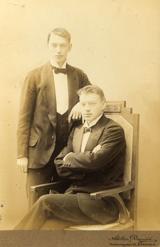 Bildtext: Vykort tillsänt Anna Lindgren, poststämplat Norrala 1914. Ur texten på kortet kan utläsas namnen Karin Mattsson och Emma Sundin. Inkommen bildsynpunkt kompletterar: Fr v bak: Helena Enqvist (f Helena Bodinsson), Lars Olof Enqvist, Magnus Enqvist, Marta Enqvist (f Marta Eriksdotter). Fr v fram: okänd, Gösta Enqvist (pojken), Karin Hansson (f Karin Olsson). Lars Olof Enqvist f 1874 i Å, Norrala, bodde i Rengsjö, Bollnäs med hustrun Helena Bodinsson f 1874 på Sand, Svarven, Norrala och deras som Gösta f 1909 i USA. Magnus "Manne" Enqvist f 1880 i Å, Norrala, g 1911 m Marta Eriksdotter (1883-1916) f i Berge, Norrala. Lars Olof och Magnus var söner till Carl Magnus Enqvist (1843-1914) f i Myra, Enånger och Kristina Enqvist (1845-1926) f Hansdotter i Vad, Norrala. Karin Olsson f 1890 var dotter till Olof Matsson (1844-1917) f i Finnika, Enånger och Gustava Matsson (1849-1895) f Hansdotter i Vad, Norrala. Bodde i Ol-Mats, Närby, Norrala. Karin var kusin med Magnus och Lars Olof Enqvist.