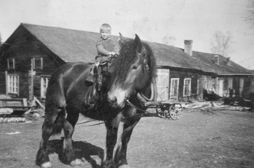 Jonny Enberg till häst framför uthusbyggnaden (numera riven) tillhörande hemmanet i Grimbo. Byggnaden innehöll stall, ladugård, mm