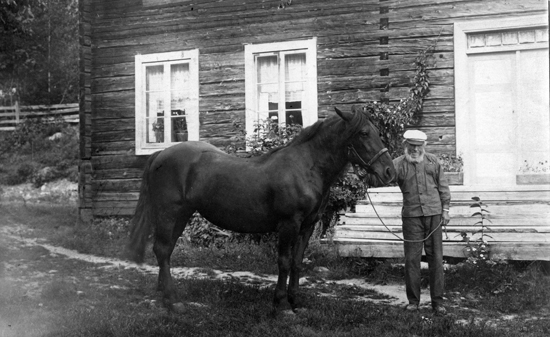 Sökord: män, djur, häst, hus, byggnader, timmerkälke
